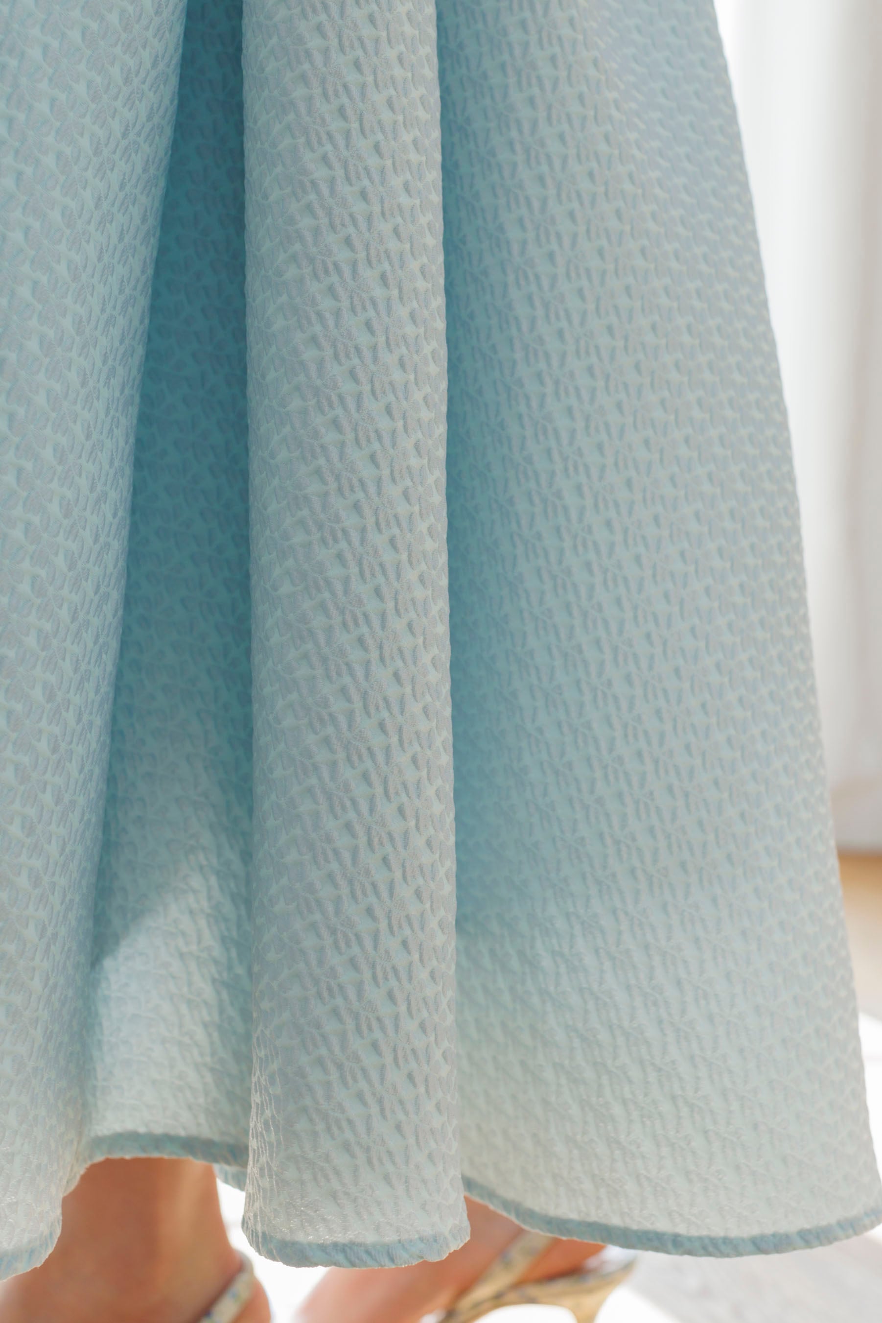 ハリのあるジャガード生地と変形フレアシルエットが着るだけで華やかな印象のスカートです。