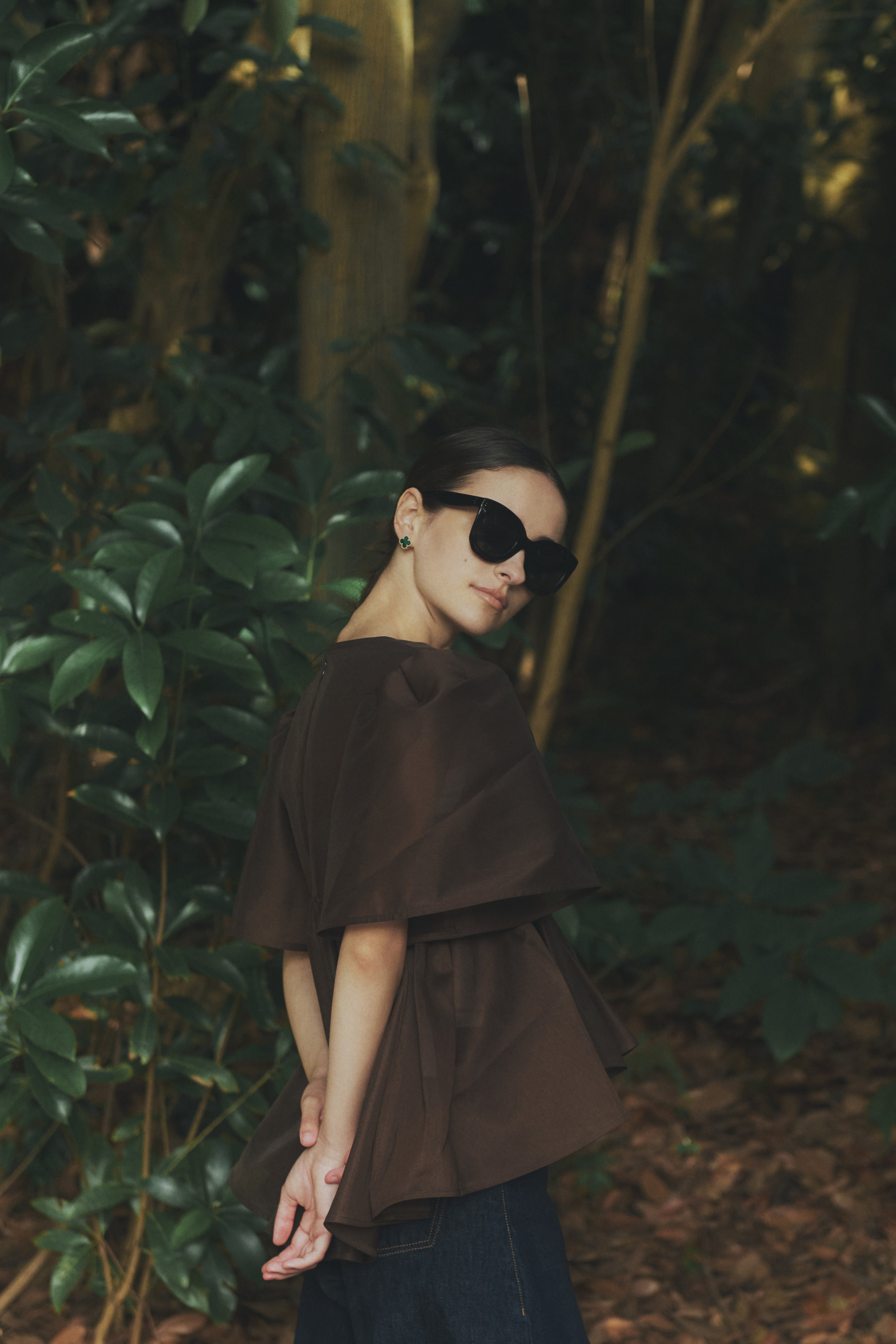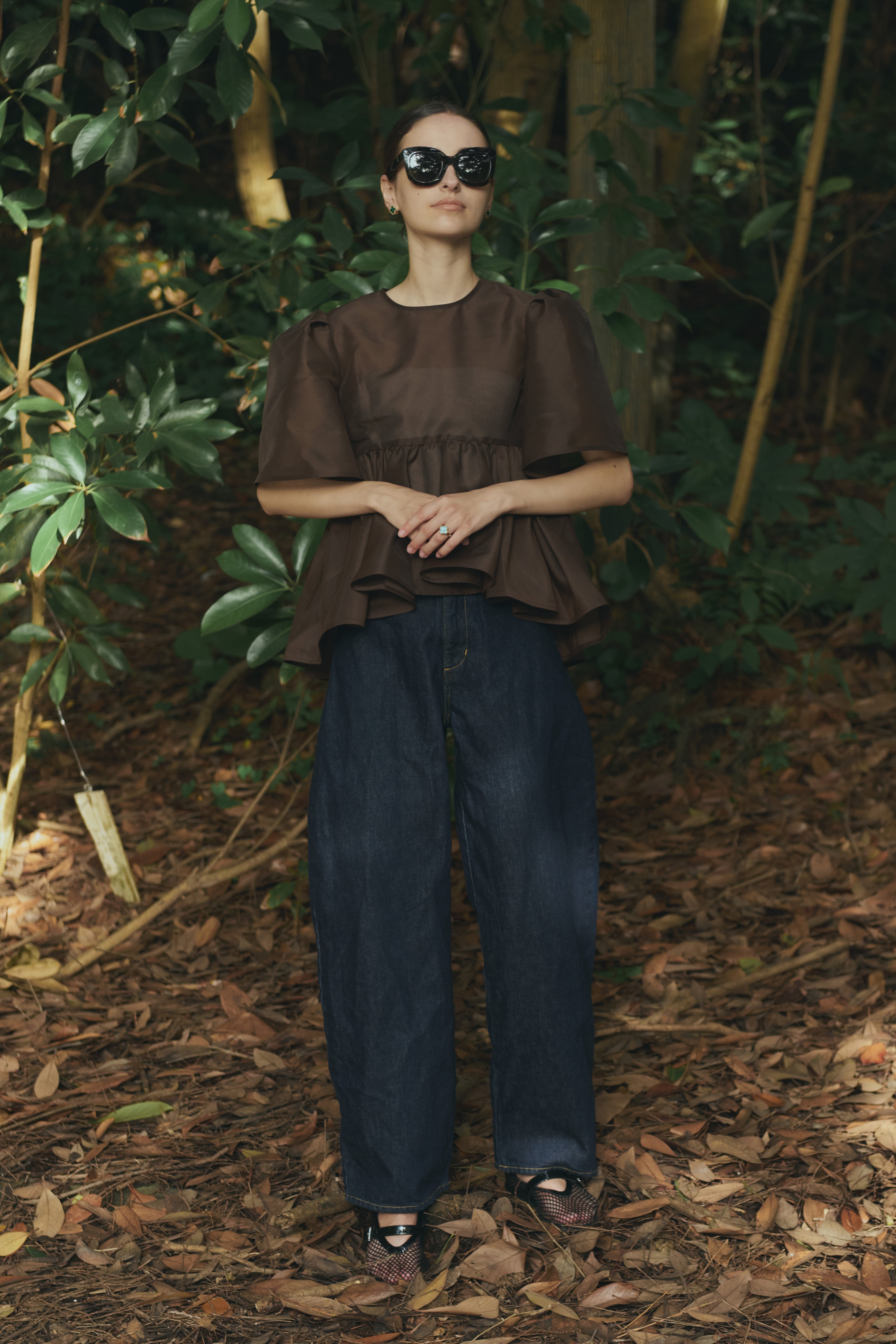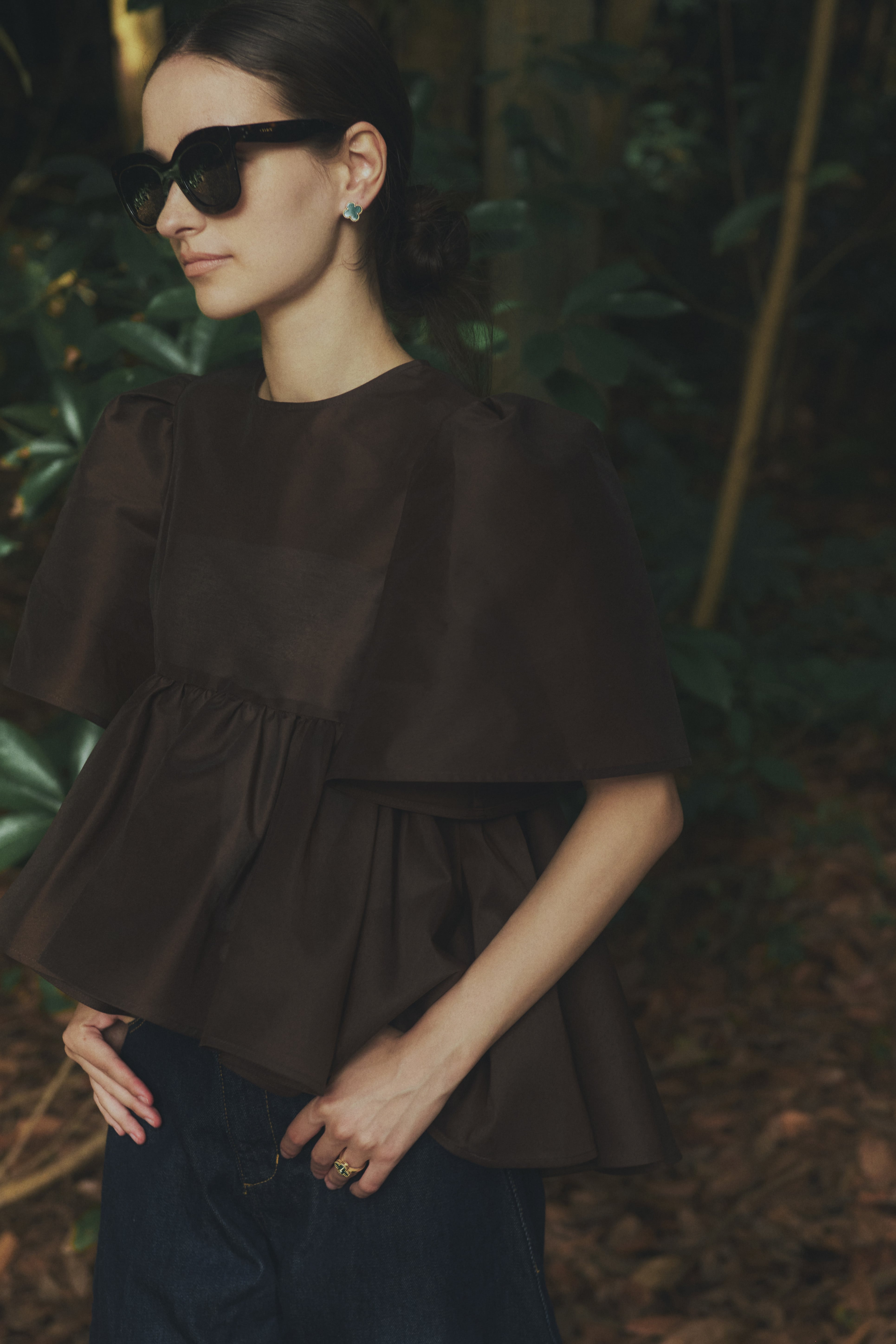 贅沢なギャザー使いとボリューミーでペプラムなヘムラインが特徴なベルスリーブのブラウスは、フロントは短めに、バックスタイルはヒップも隠れる長めの設定で腰位置を高く見せ、スタイルアップ効果も抜群です。