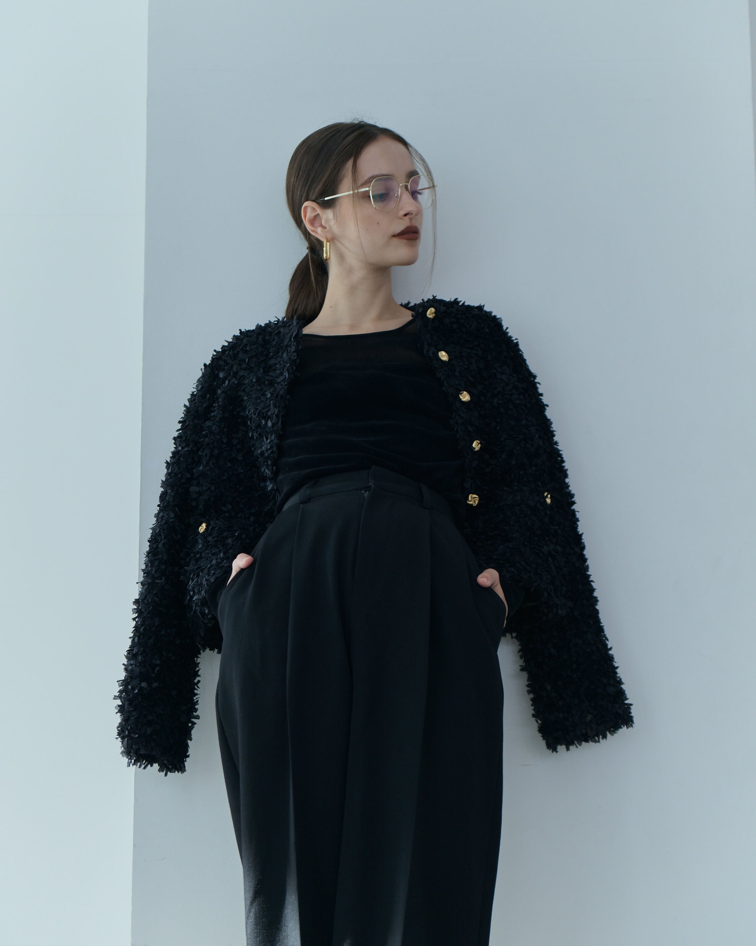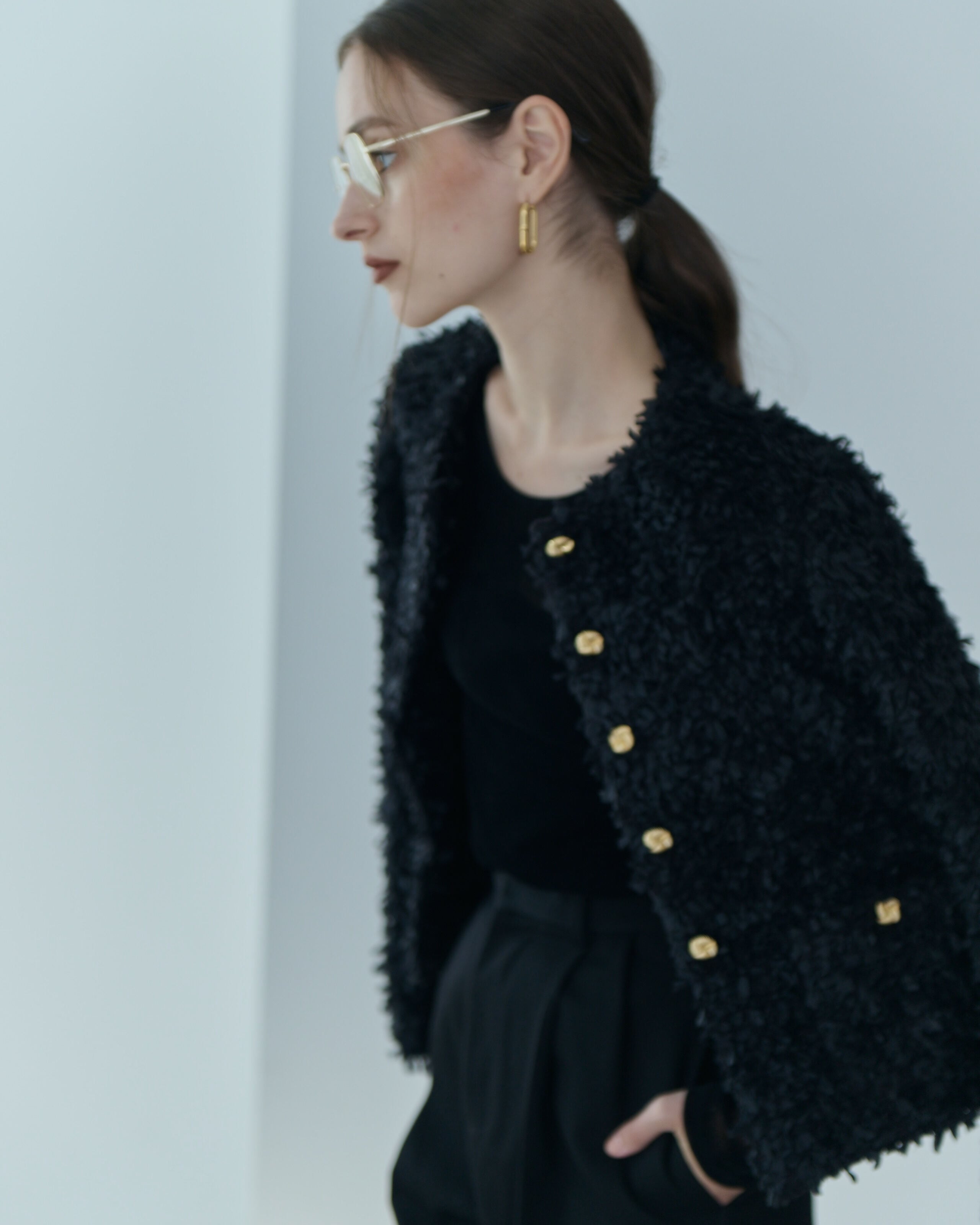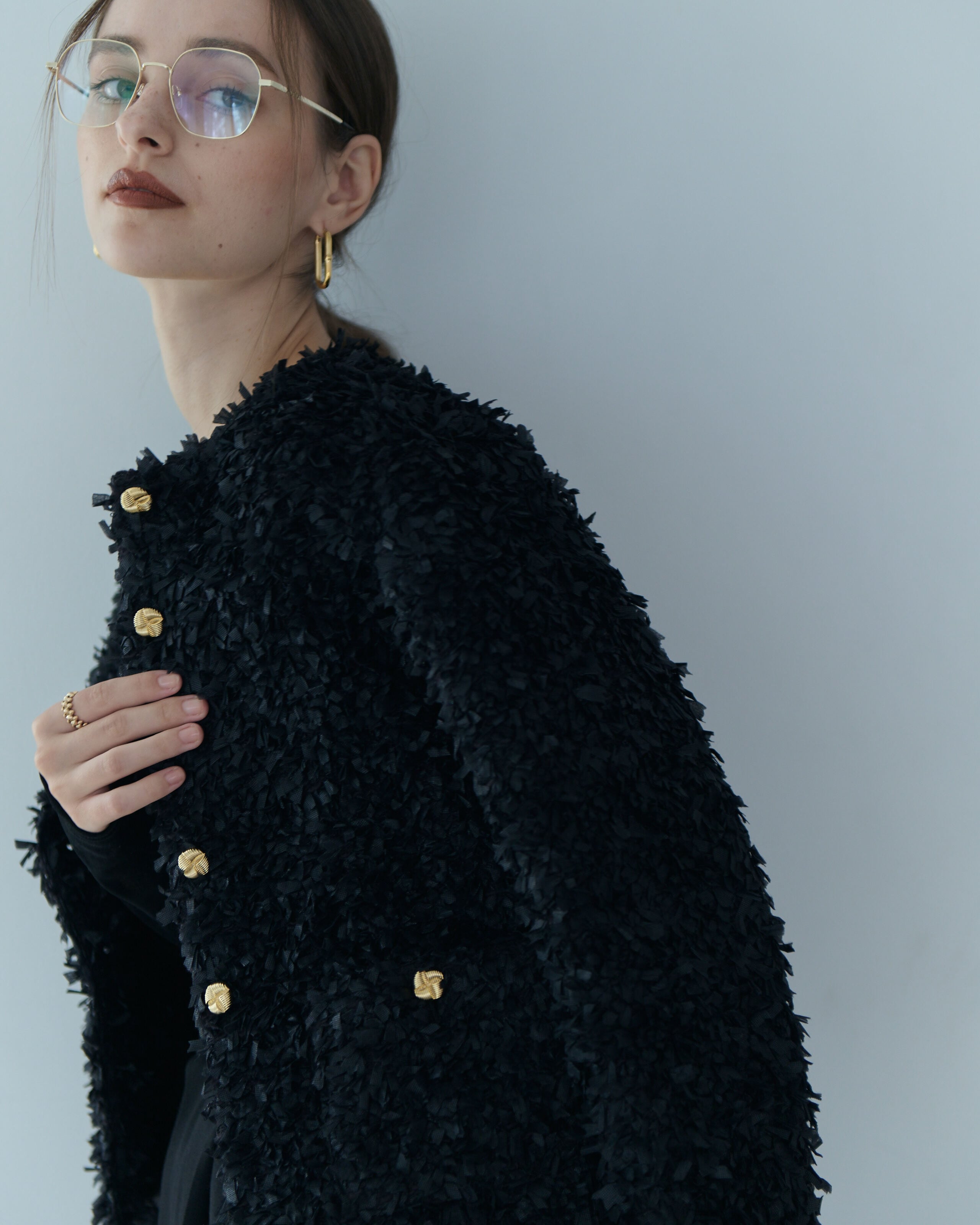 軽くしなやかで表面感のある生地なのでニットカーディガンのようにさっと羽織りやすく、華やかで品よくまとまるゴールドボタンがポイントなコーディネートの主役になる1枚です。