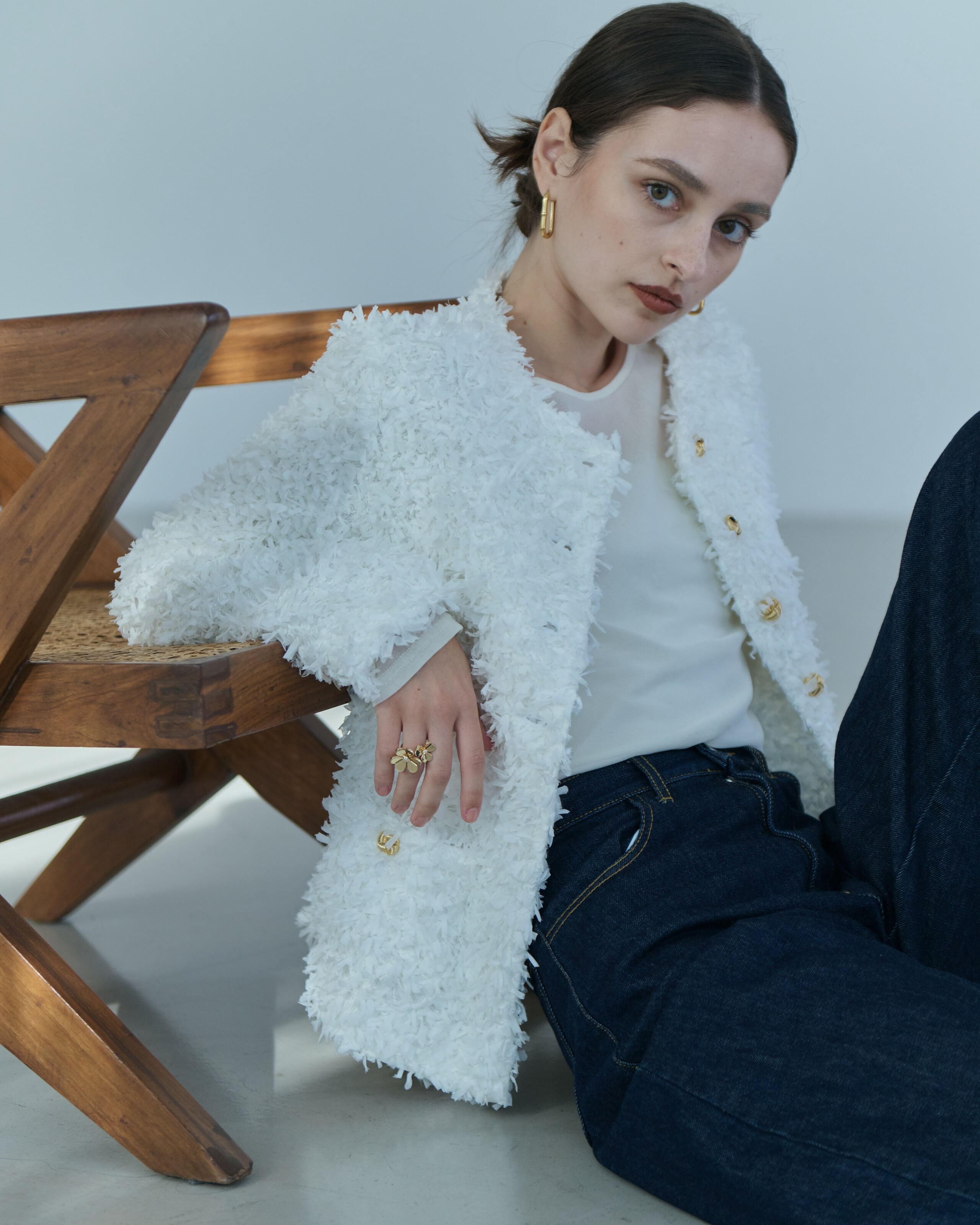 抄繊糸をふんだんに使用、インレー組織で編みたてた意匠性の高い素材で仕上げたジャケット。