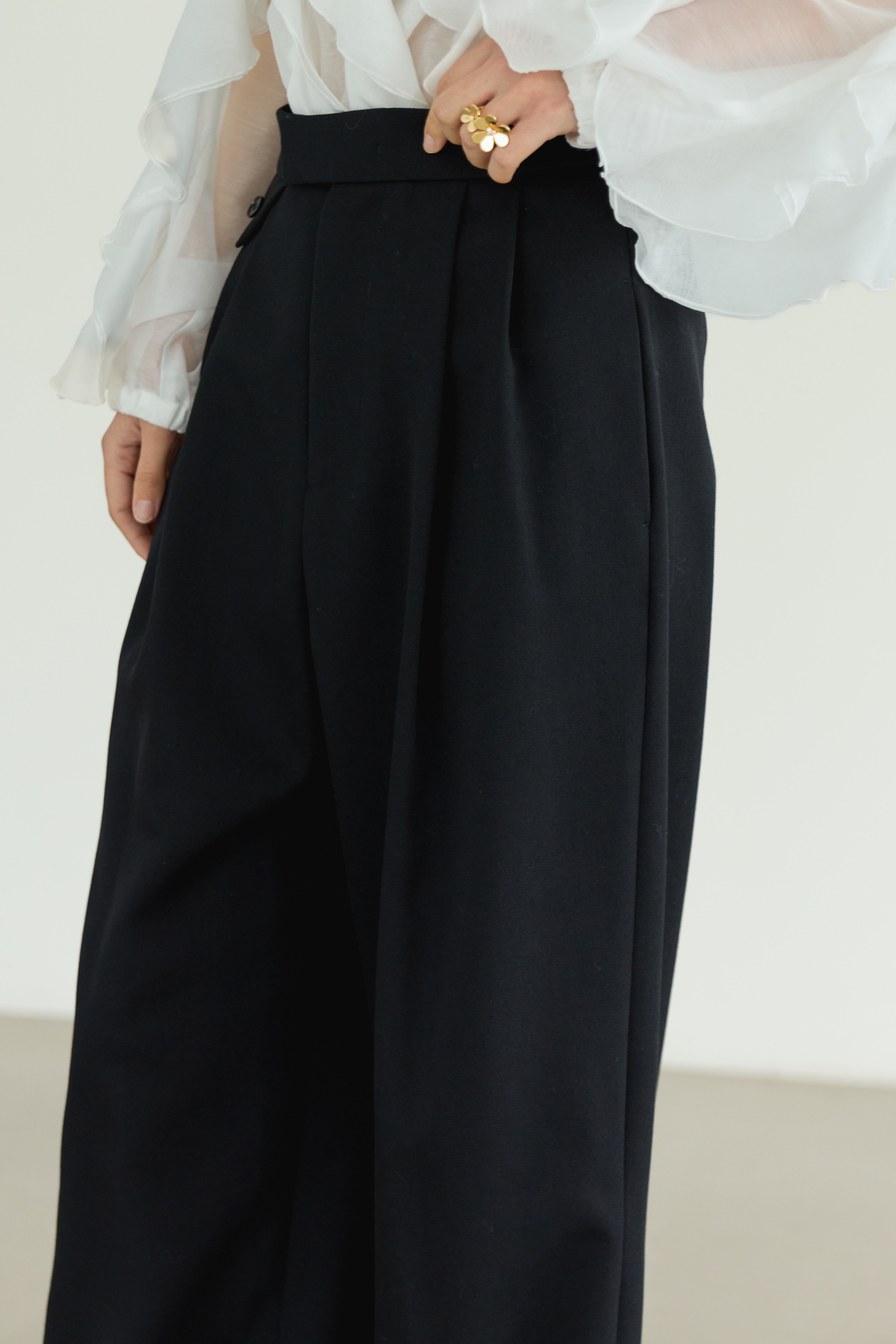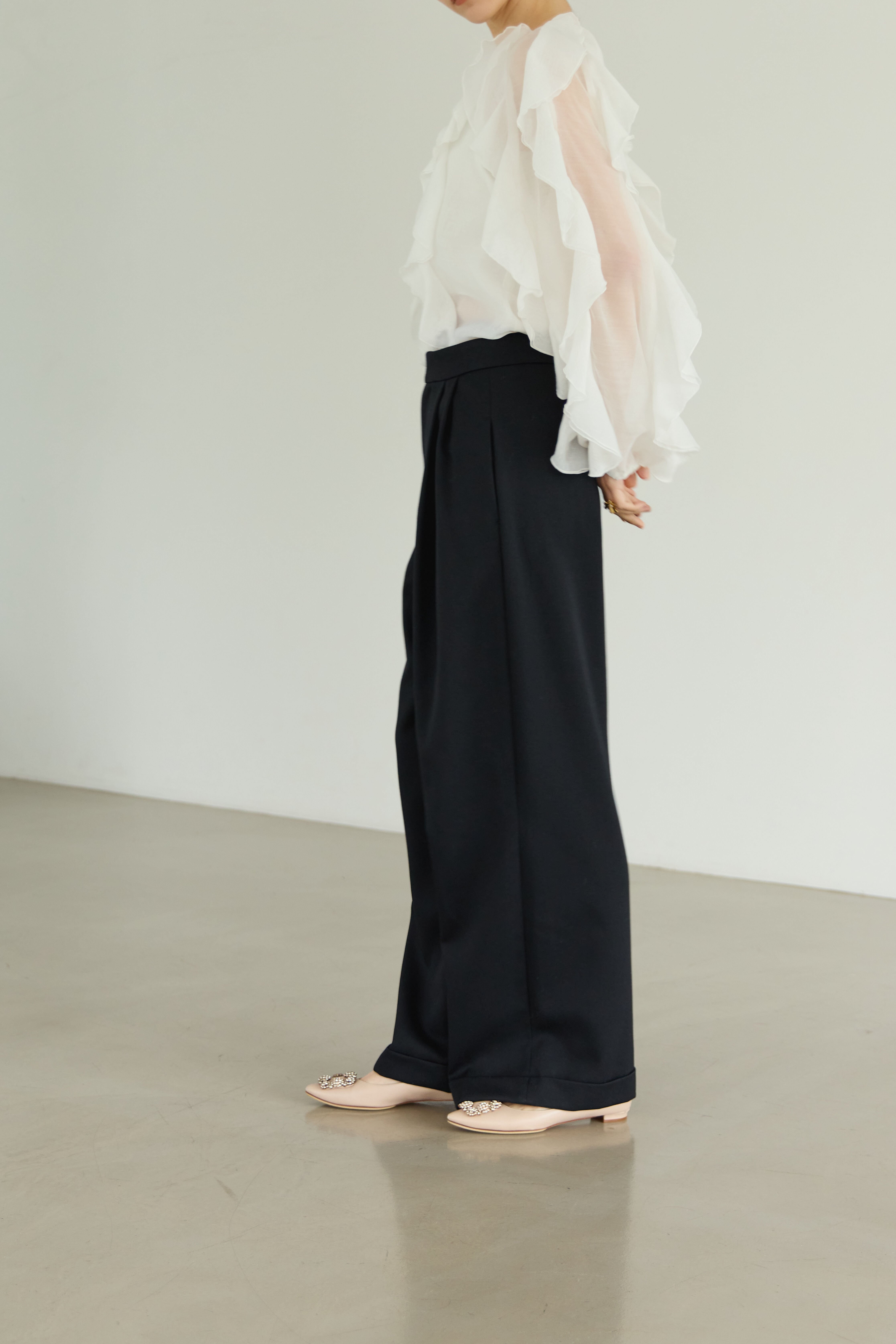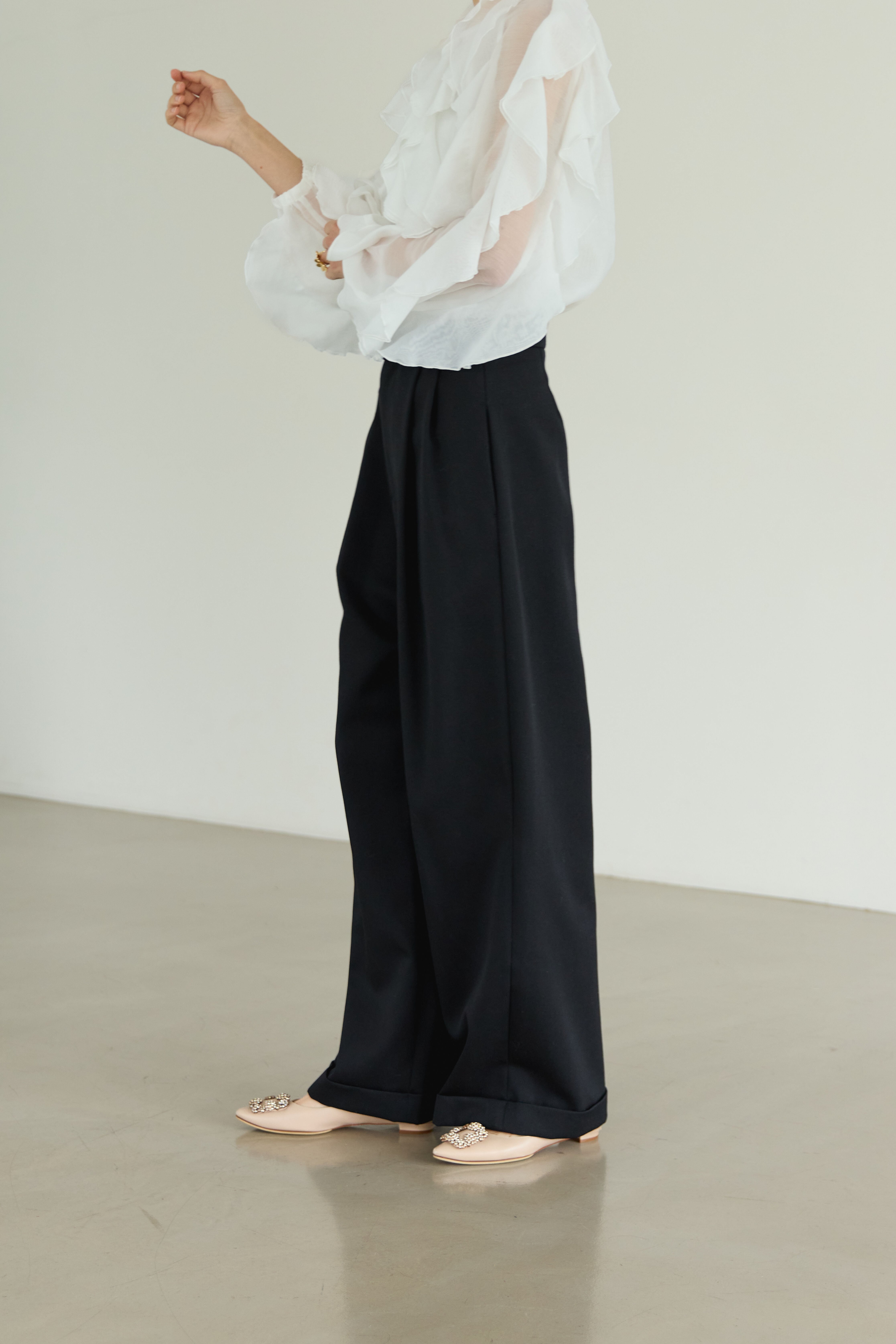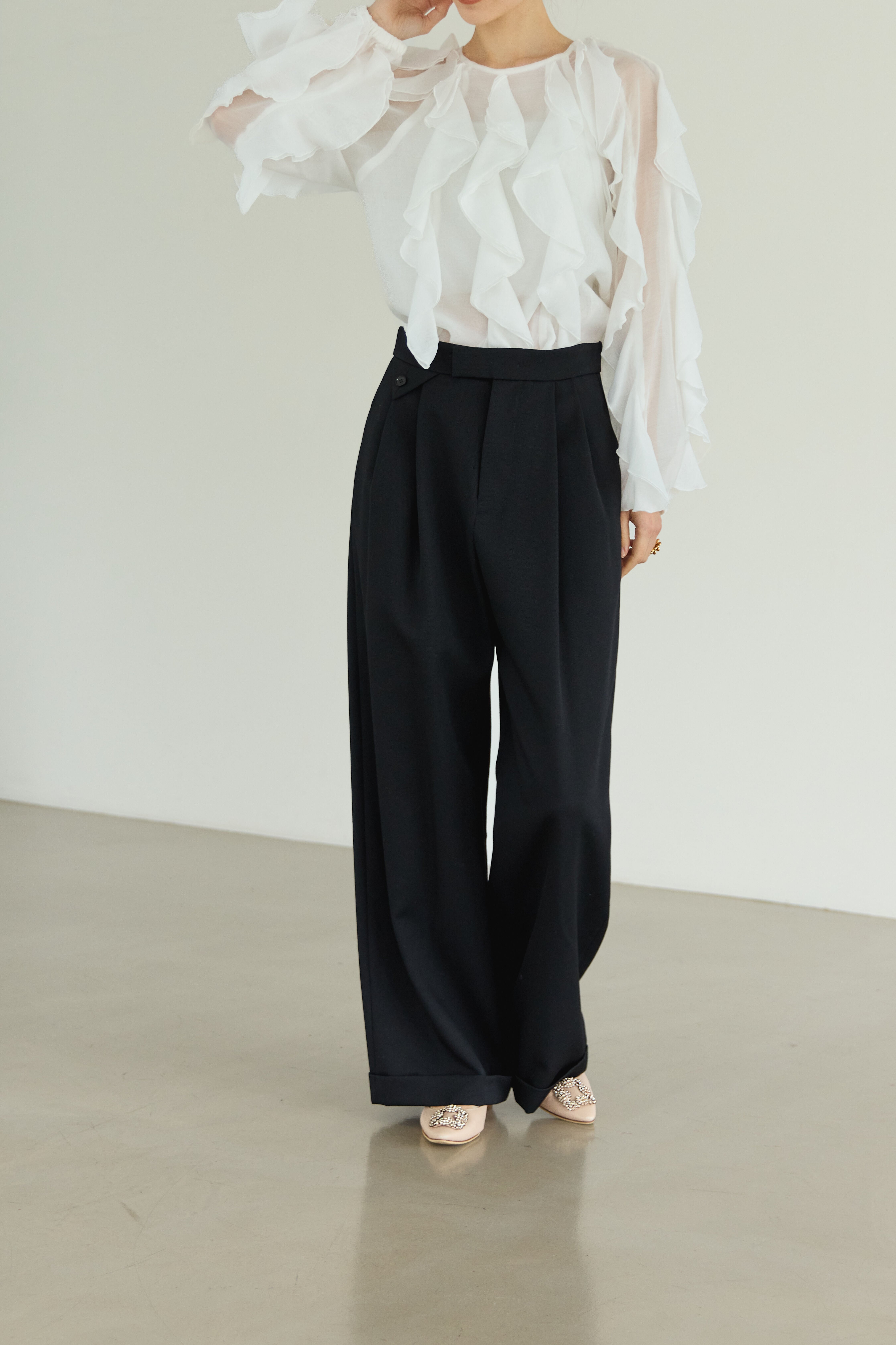 優れたwool gaba素材を使用した滑らかな肌触りと高い品質が自慢のワイドパンツです。