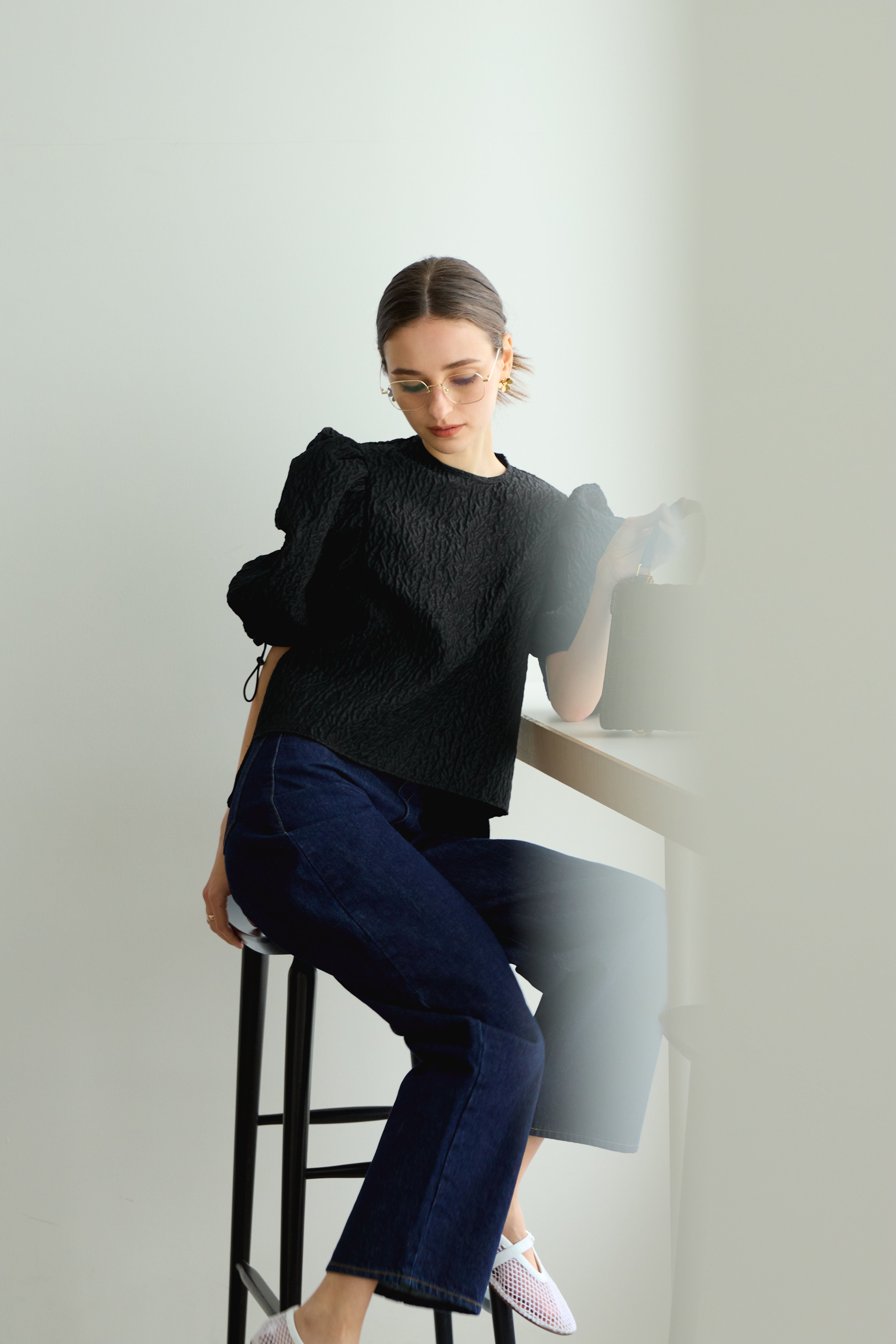 織りで生まれる立体的な陰影と、光を受けてほのかに艶めく上品な質感が、シンプルなシルエットに奥行きを添えます。
