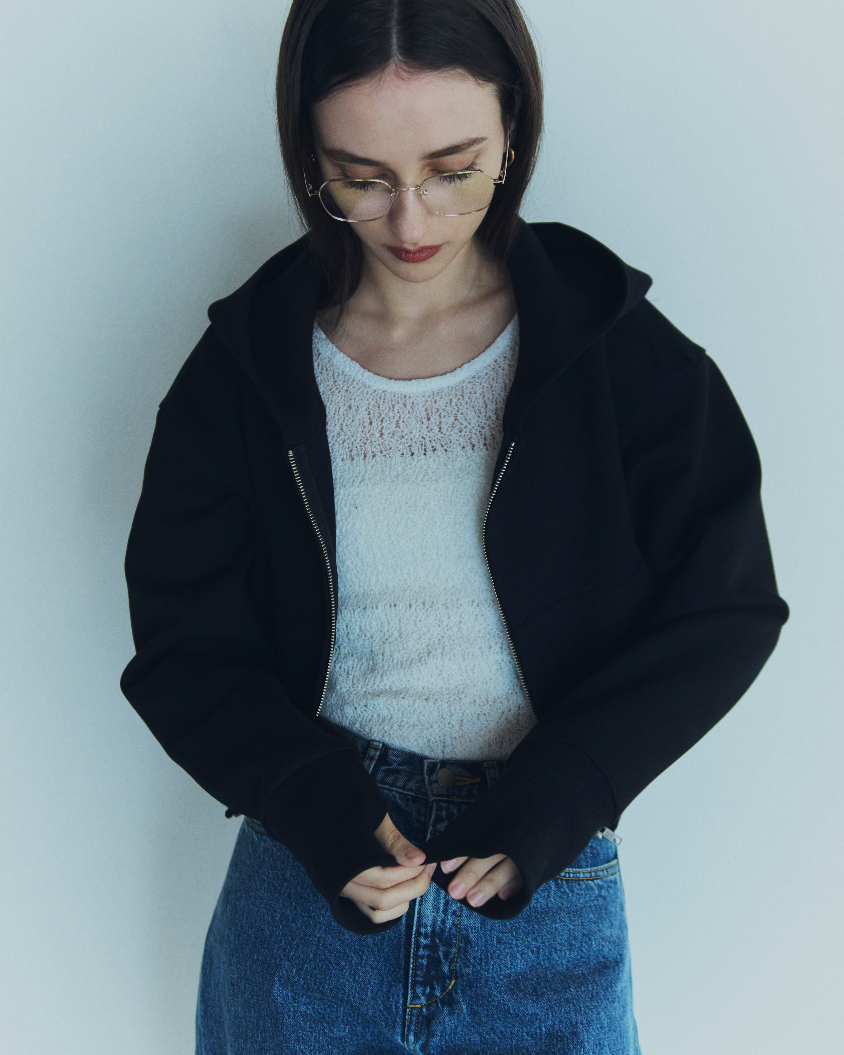 長めに設定したスリーブにはフィンガーホールを、ショート丈のコンパクトなレングスでスタイルアップ効果と抜け感を演出。